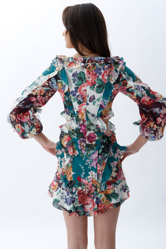 ZIMMERMANN ALLIA SPLICED FLORAL CUT OUT MINI DRESS PRINT SIZE 0 / AU 8